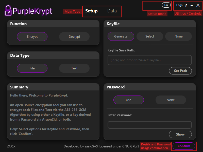 Fig.1.1 shows the layout of the Setup tab. The right half of the interface, where the Keyfile and Password boxes