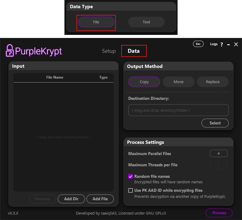 Under Process Settings, you can configure the number of files to process in parallel, choose whether to assign random filenames to encrypted files,